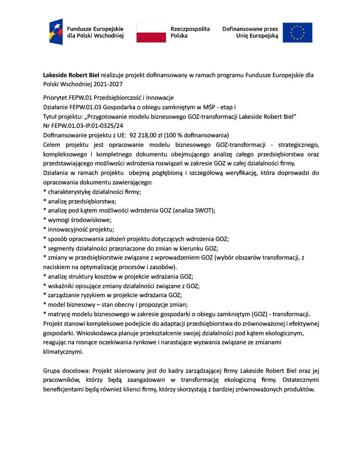Celem projektu jest opracowanie strategicznego modelu biznesowego GOZ (gospodarki o obiegu zamkniętym) – kompleksowego dokumentu, który pozwoli nam jeszcze lepiej analizować i rozwijać naszą działalność w zgodzie z zasadami zrównoważonego rozwoju.